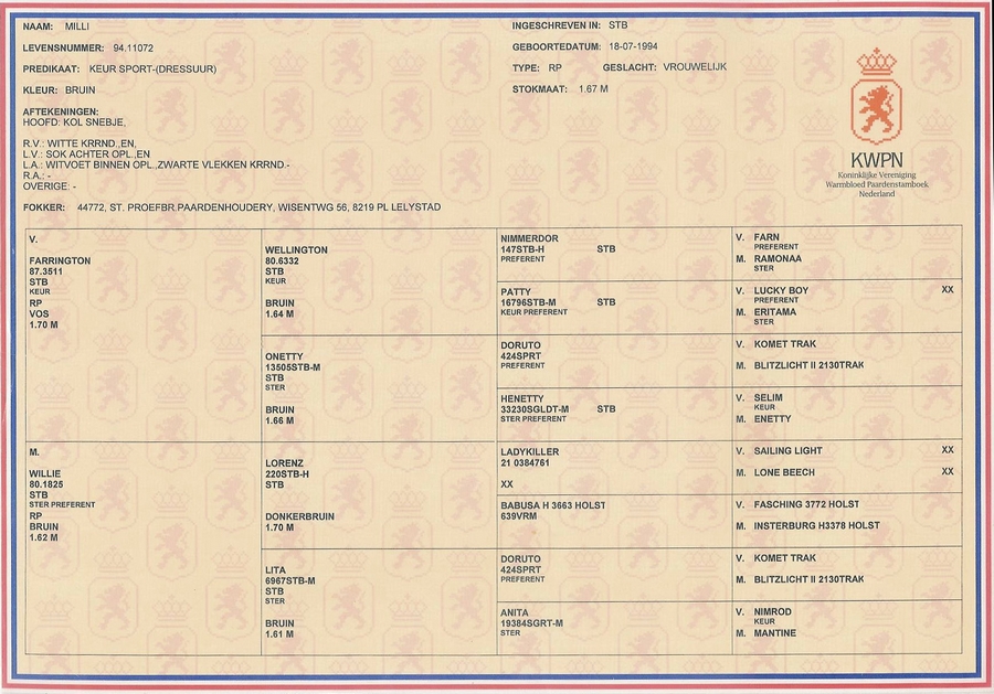 Milli (Farrington x Lorenz x Doruto) is Z2 dressuur startgerechtigd, keur sport dressuur. Er lopen zowel in de dressuur als bij het springen paarden internationaal uit deze bloedlijn. Milli is mijn maatje. Ze loopt overal langs en over, en is een super leermeester(es) voor de jonge paarden.