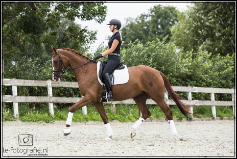 Fijne merrie, goed karakter. Geeft met rijden altijd een safe gevoel. IJverig onder het zadel, zit makkelijk. Allround paard, loopt fijn dressuur, doet netjes een sprongetje. Ook fijn paard voor cursus. Makkelijk in de trailer en op ander terrein.